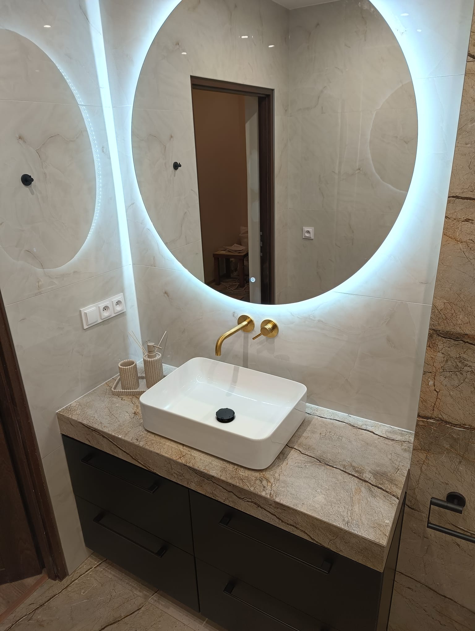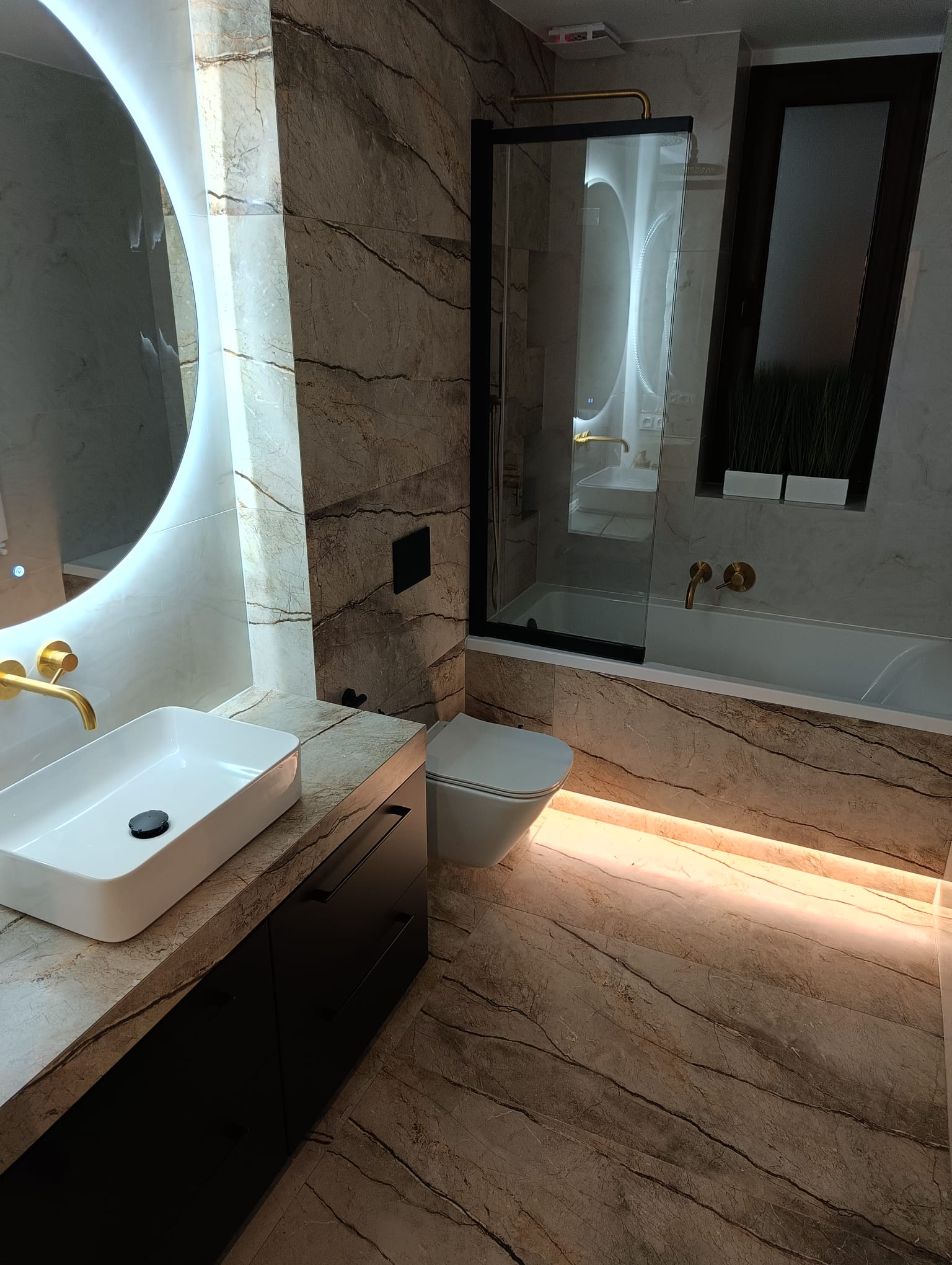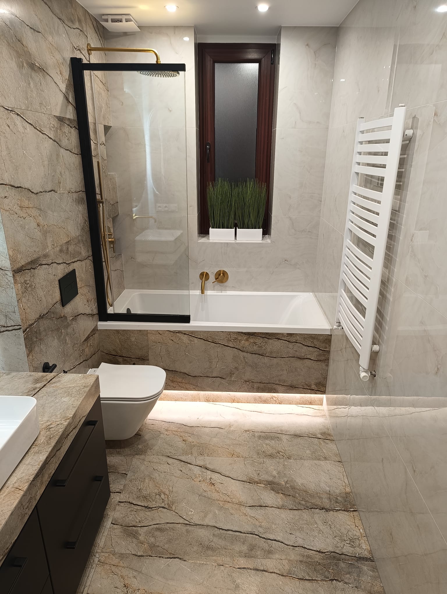 Stylowa łazienka z jasnym kamieniem na ścianach, nowoczesną kabiną prysznicową w czarnej ramie oraz komfortową wanną. Umywalka o minimalistycznym designie i subtelne oświetlenie LED tworzą przyjemną atmosferę.
