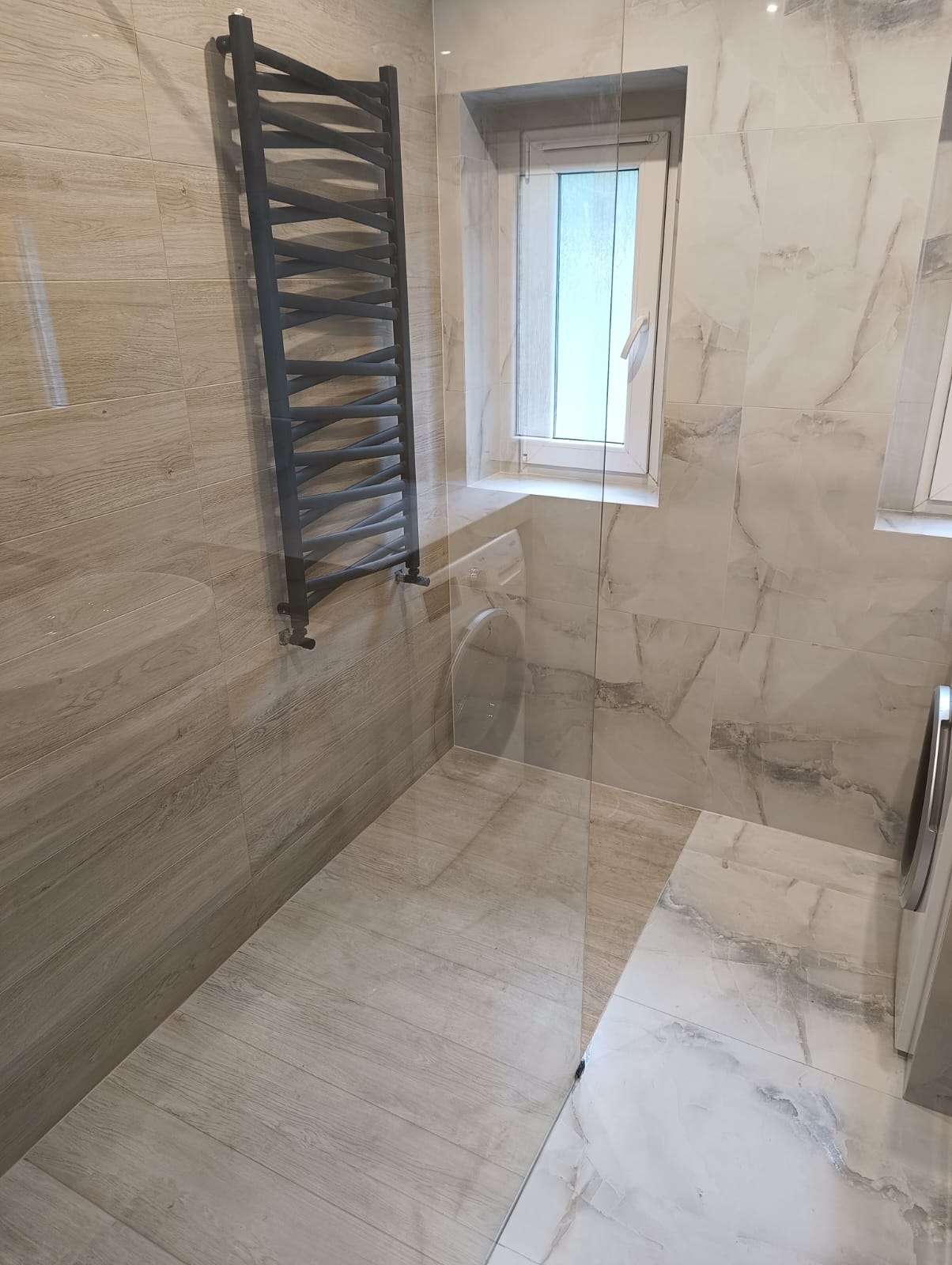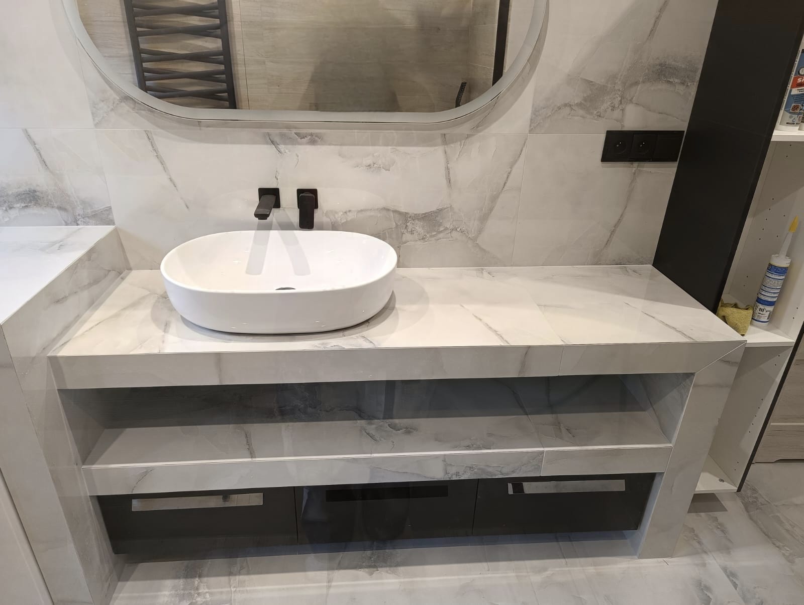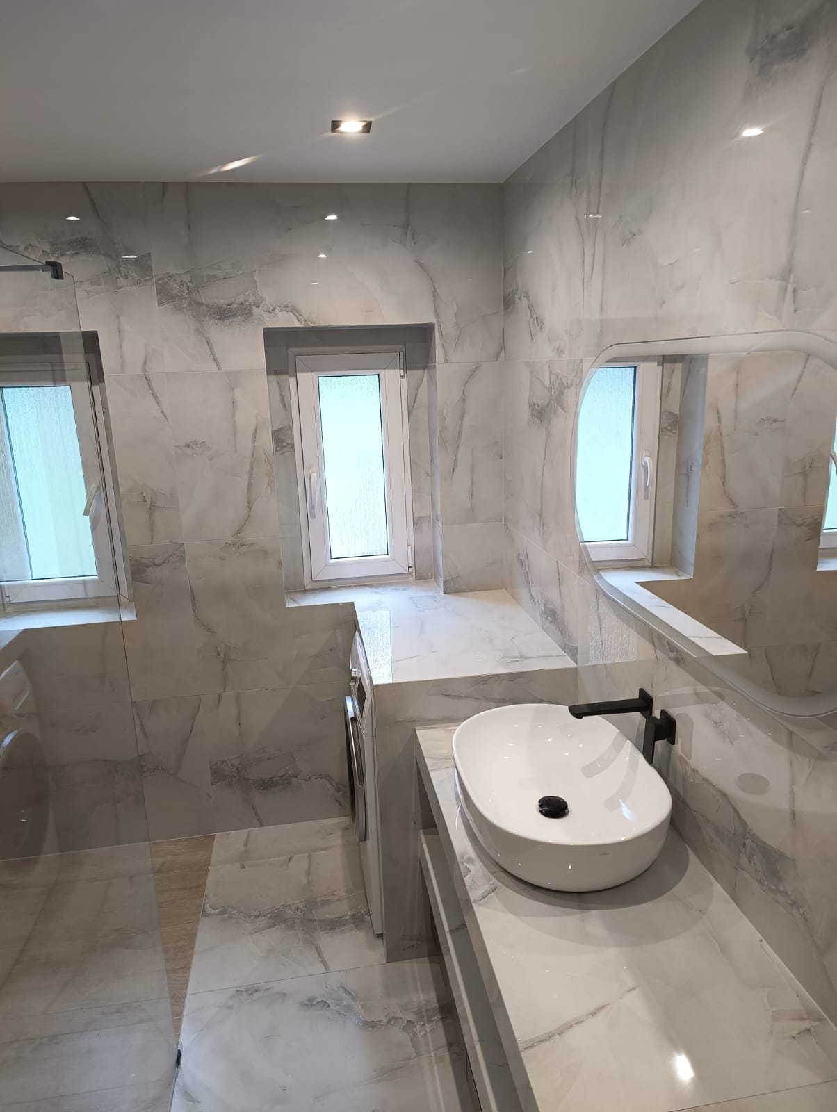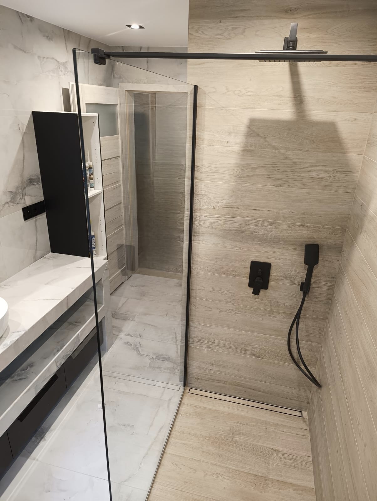 Ta nowoczesna łazienka charakteryzuje się minimalistycznym designem i eleganckim wykończeniem. Szklana kabina prysznicowa dodaje lekkości, a jasne, naturalne kolory ścian wprowadzają przytulną atmosferę. Funkcjonalne elementy, takie jak umywalka na szerokim...