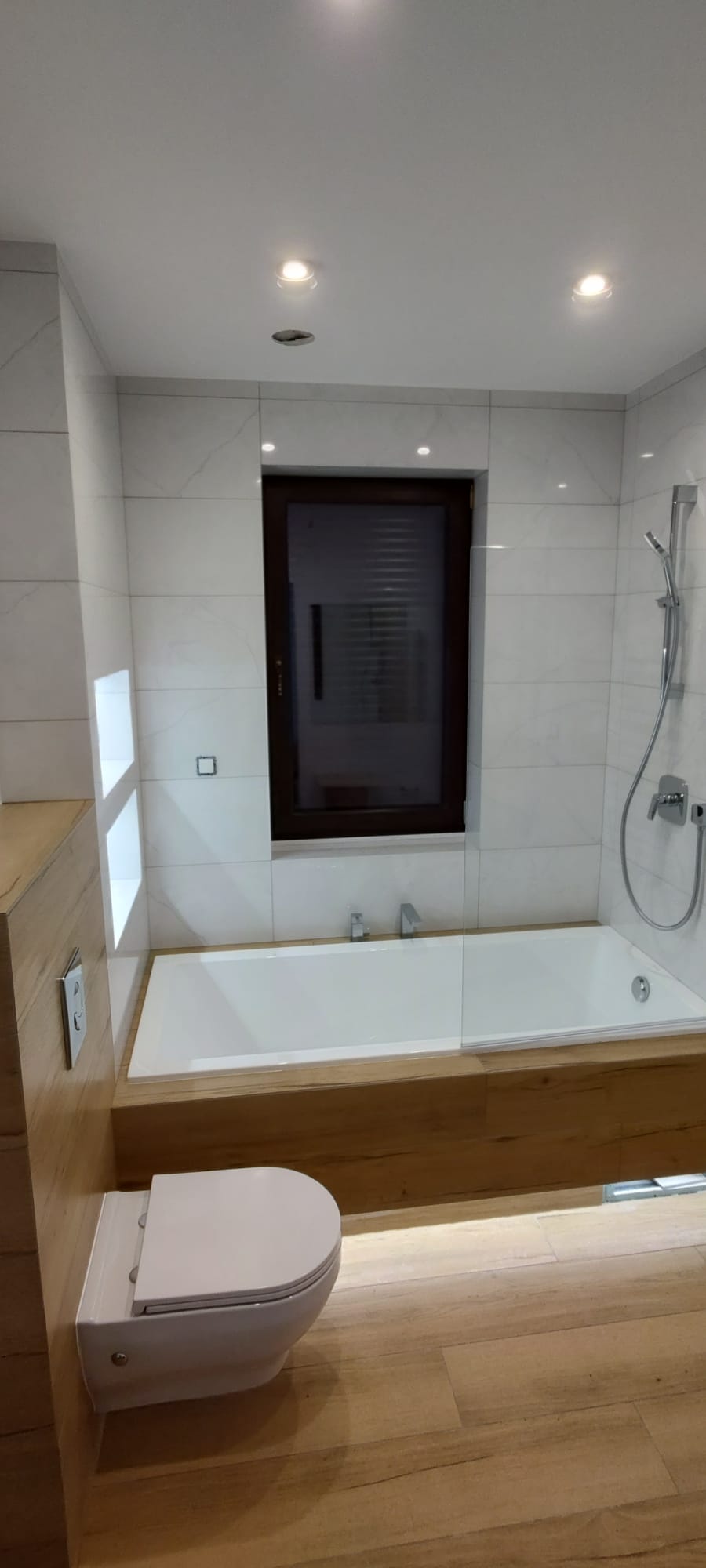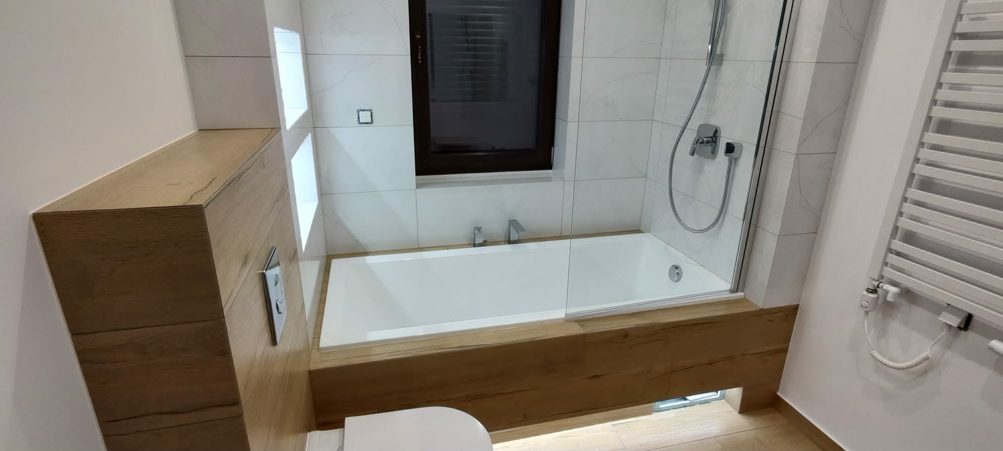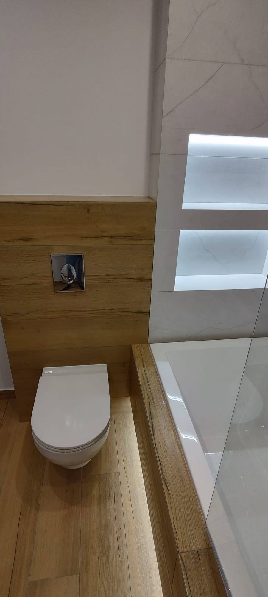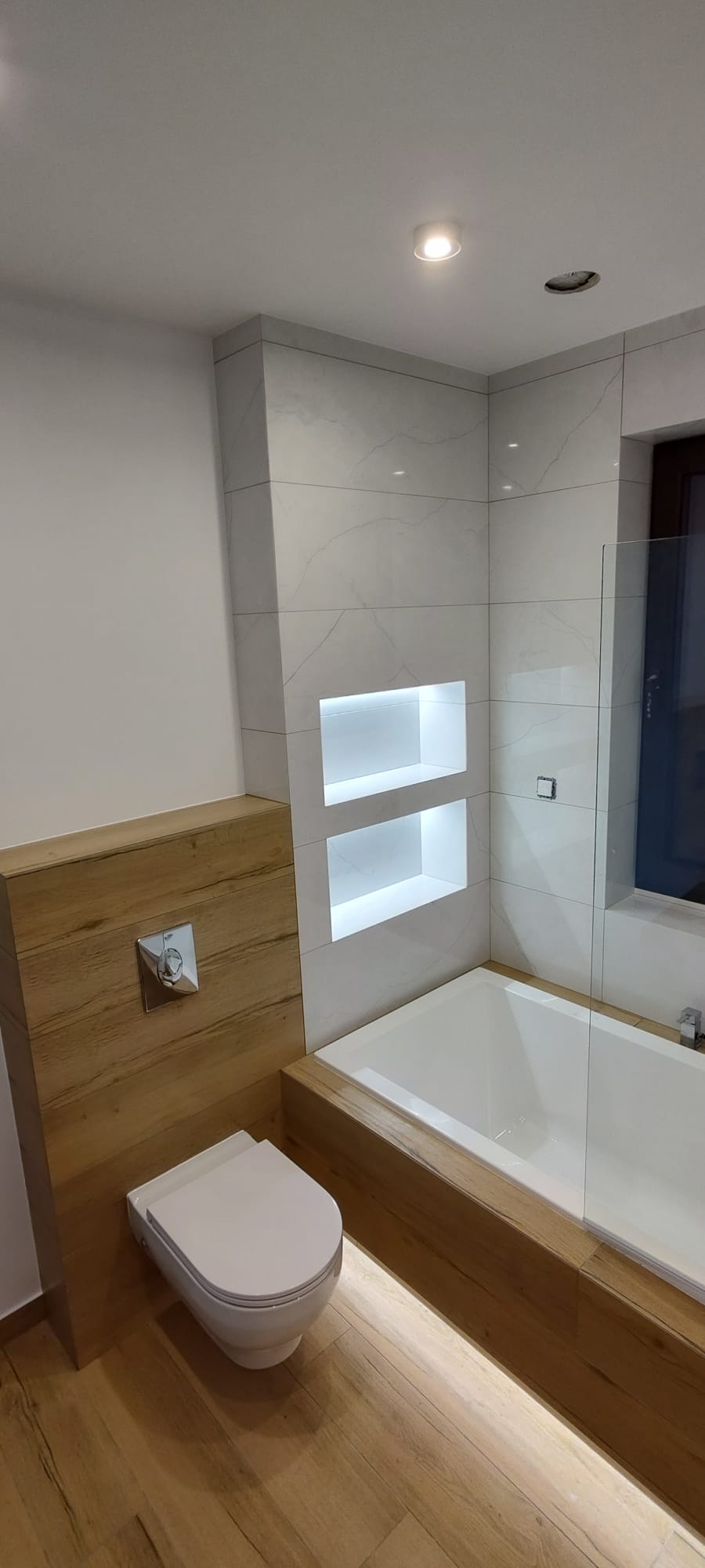 Realizacja nowoczesnej łazienki w jasnej, minimalistycznej stylistyce. Ściany wykończone płytkami imitującymi marmur. Zabudowa wanny oraz stelaża WC wykonana z elementów drewnopodobnych, które ocieplają wnętrze. Nad wanną zaprojektowano podświetlane wnęki w...